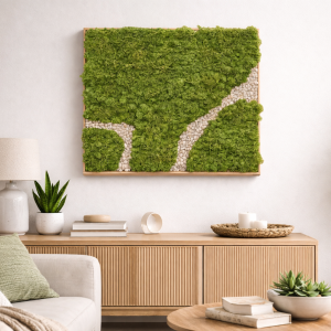 Originálne nástenné hodiny vyrobené z prírodného dreva doplnené stabilizovaným machom, ktorý vytvára jedinečný organický tvar a moderný prírodný vzhľad.